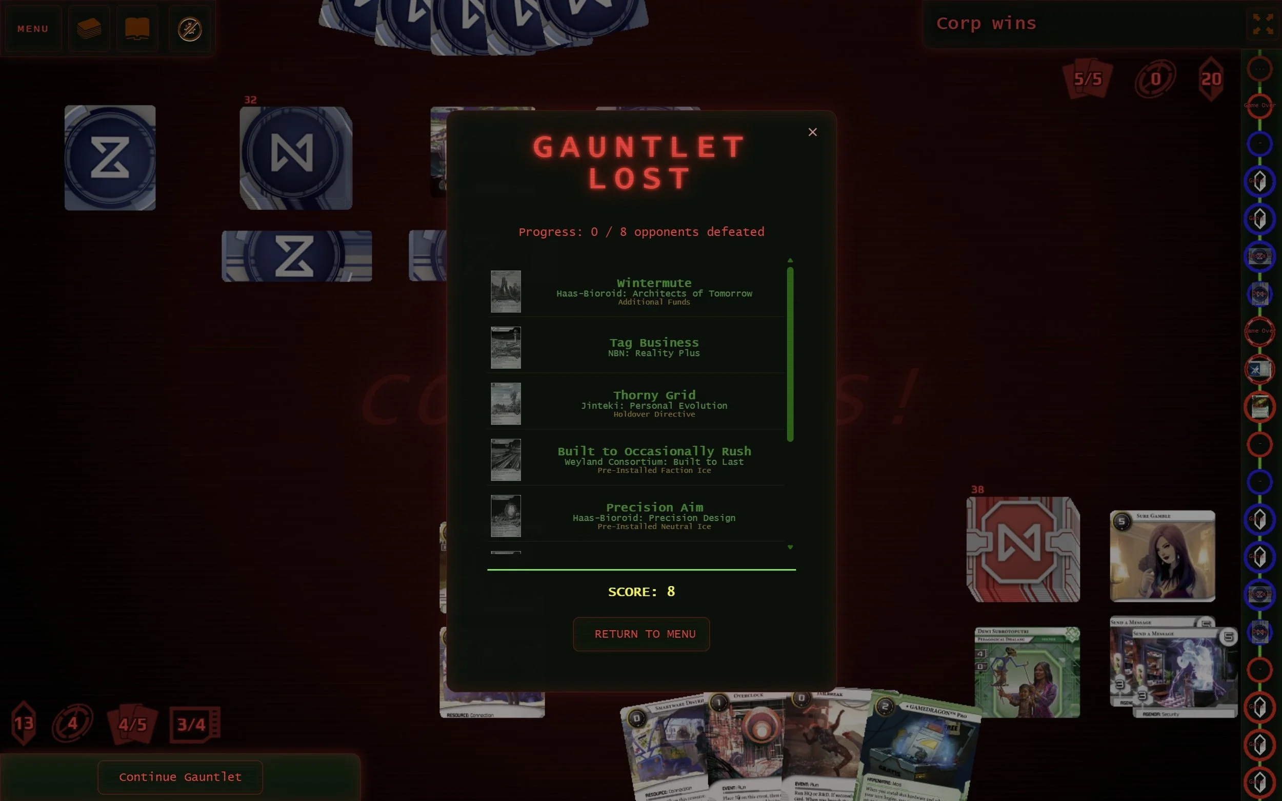 As it became more difficult to play Netrunner in person, I wanted to update the Netrunner client that I play on my commutes to work. Netrunner: Solo Mode transforms the niche card game into a polished single-player experience. It is built on the foundation of the Chiriboga engine, and it extends the bare-bones engine into a fully-featured solo experience with multiple game modes, an achievement system, customization features, better on-boarding and a unique rogue-lite mode.